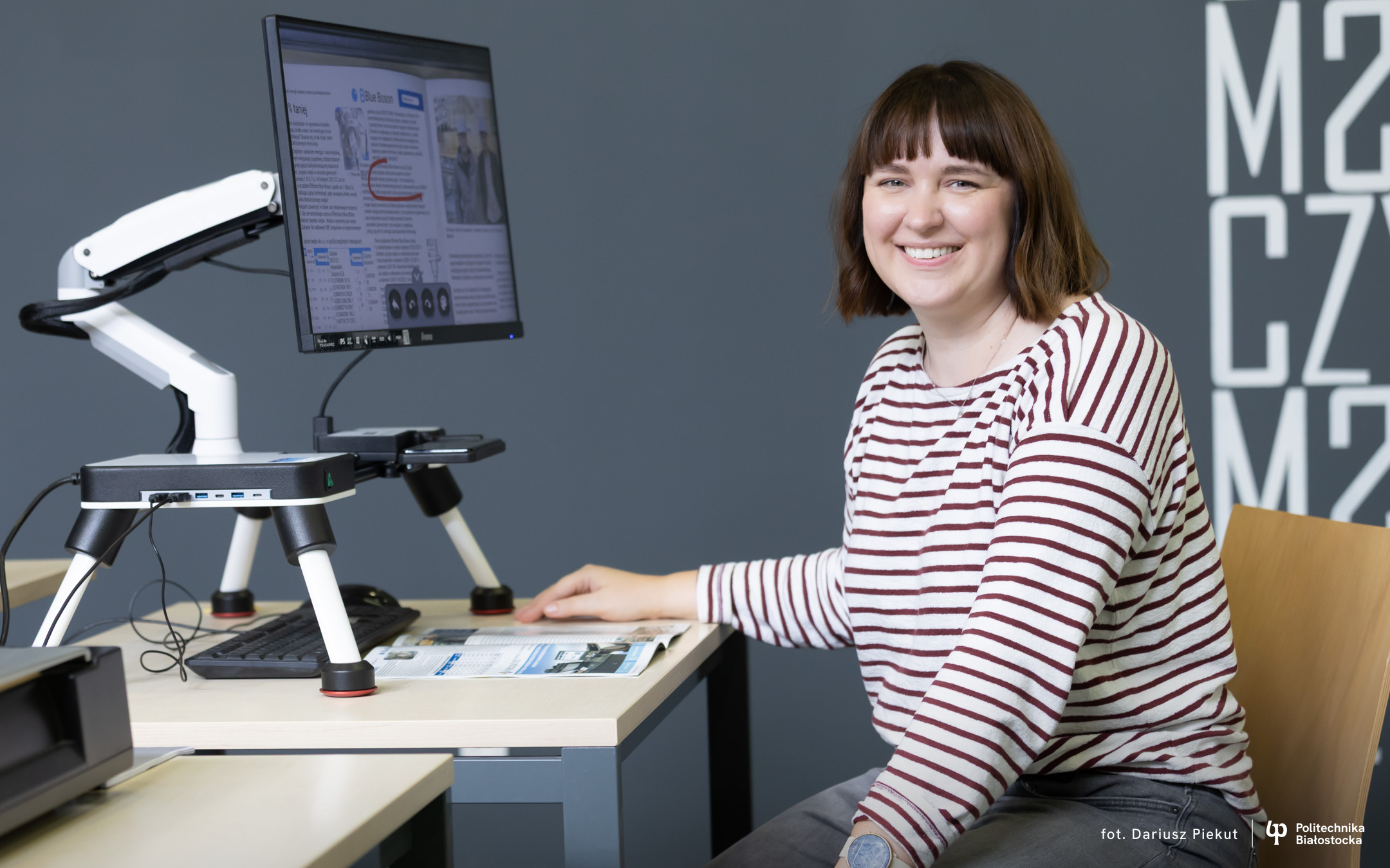 Osoby słabowidzące oraz studenci obcojęzyczni mogą korzystać z trzech nowoczesnych powiększalników z funkcją skanowania, 64-krotnego powiększania, głośnego odczytywania tekstu i tłumaczenia na języki obce. Nowe urządzenia, zakupione w ramach projektu „PB Dostępna 2.0 – nowoczesna uczelnia dla wszystkich”, znalazły swoje miejsce w Bibliotece Głównej Politechniki Białostockiej oraz w bibliotekach wydziałowych na Wydziale Inżynierii Zarządzania w Kleosinie oraz na Wydziale Architektury w Białymstoku.