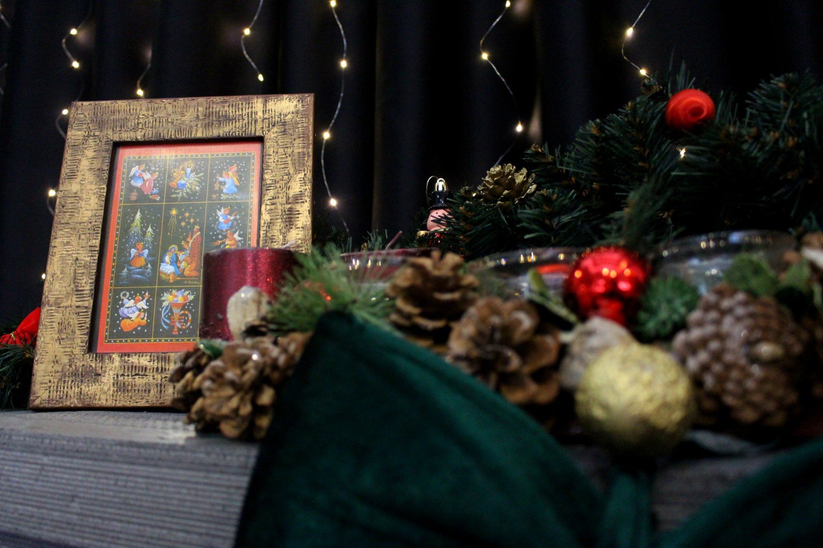 Nasza świąteczna ścianka to prawdziwa bożonarodzeniowa pocztówka. Głębię zimowej nocy rozświetla kominek, przystrojone w królewską czerwień choinki uginają się pod ciężarem wstęg, kokard i bombek, światełka lśnią jasnym blaskiem Świąt Bożego Narodzenia, miękka kanapa czeka na wędrowców, spragnionych wytchnienia, odpoczynku, poszukujących świątecznej magii.