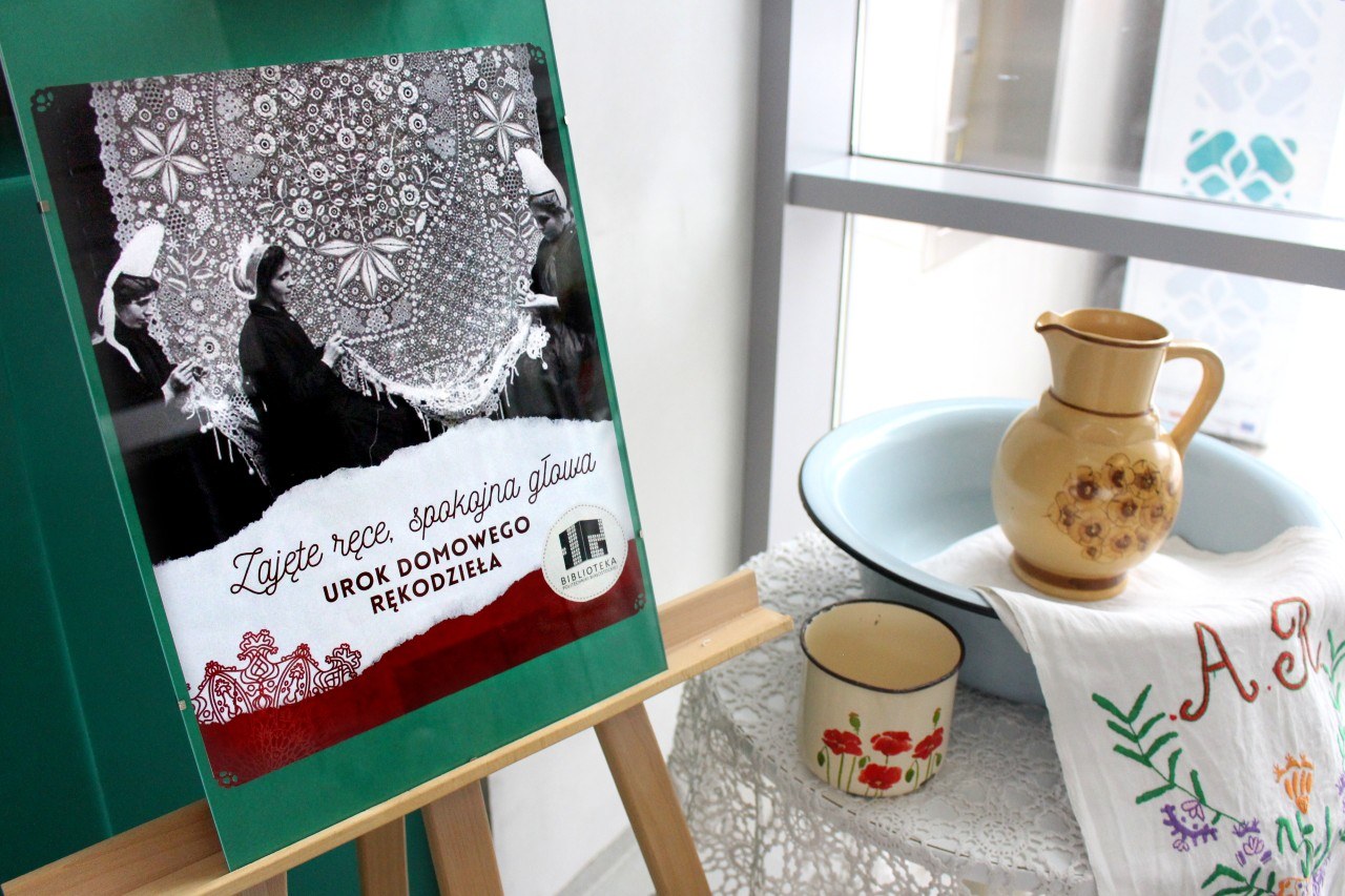 Ekspozycja to prywatne zbiory bibliotekarzy – pamiątki po babciach, mamach i bliskich, które przez dekady tworzyły dusze naszych domów. Tytuł nawiązuje do terapeutycznej roli rzemiosła; rytmiczne liczenie oczek, stukanie kołowrotka czy prowadzenie igły było formą medytacji i sposobem na spokój w trudnej codzienności.