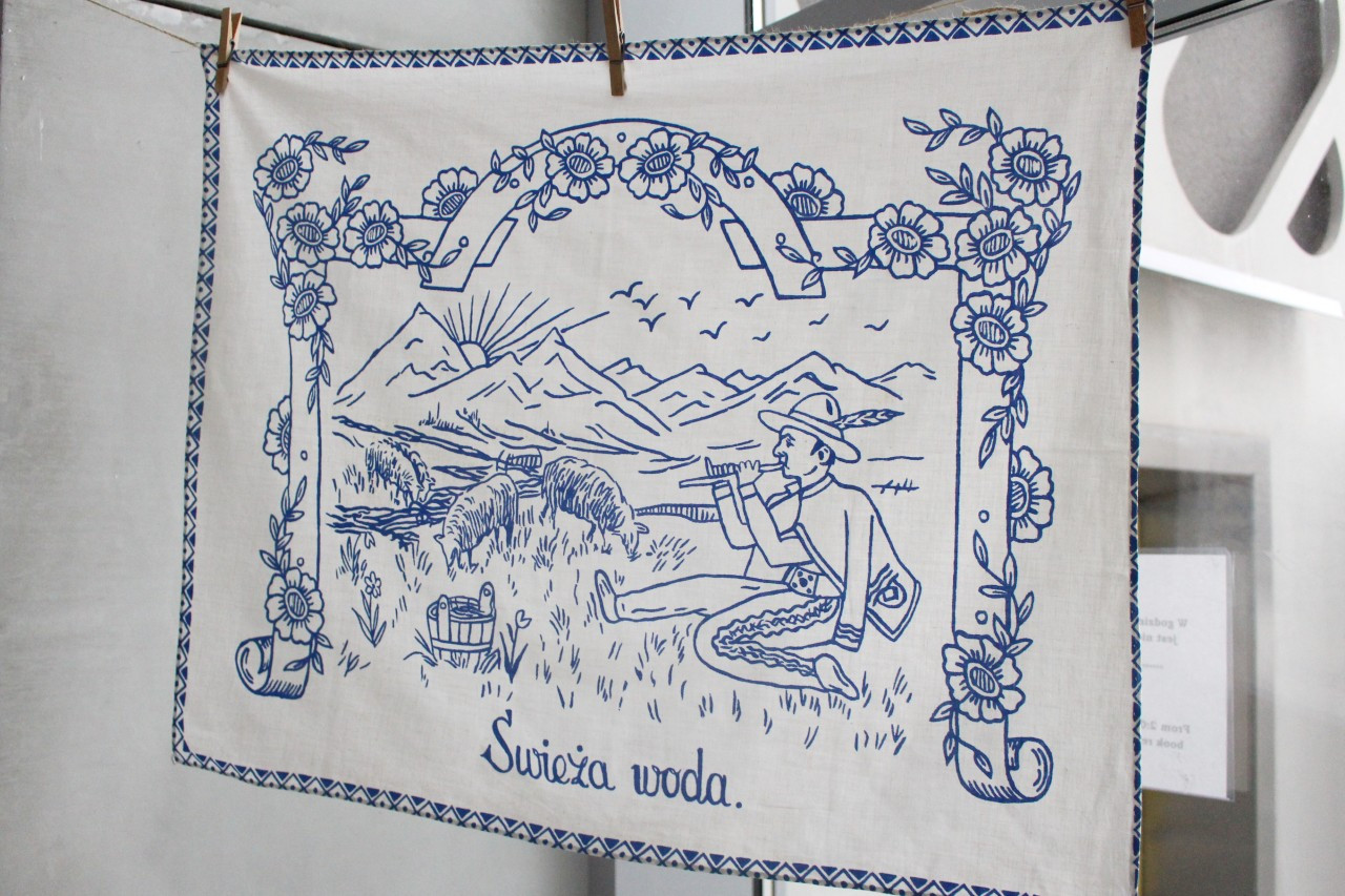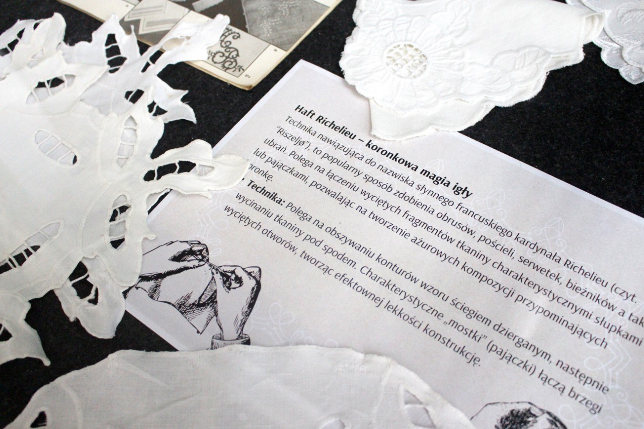 Na wystawie prezentujemy bogaty zbiór tkanin: haftowane makatki z ludowymi mądrościami, precyzyjny haft krzyżykowy tworzący misterne obrazy, koronkowe serwety oraz dzianiny. Można podziwiać także unikatowe tkaniny dwuosnowowe o odwracalnej ornamentyce oraz haft Richelieu – szczyt dawnej elegancji, łączący precyzyjne wycięcia z misternymi mostkami. Zapraszamy do podziwiania detali zrodzonych z pasji i matematycznej dokładności.